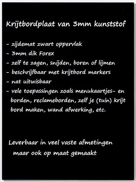 Zwarte krijtbordplaat kunststof 20x30cmWat is FOREX en wat kan ik ermee? Forex is een geschuimde pvc plaat met een bijzondere fijncellige en homogene structuur en is aan twee zijden bruikbaar. Forex is licht en vochtbestendig, zelfdovend en moeilijk ontvlambaar (B1, M1), weerbestendig en vervormbaar en heeft een zwart zijdemat en niet reflecterend oppervlak, De Forex plaat is prima rechtstreeks te bewerken zoals snijden, zagen, frezen, boren of verlijmen. Zwarte krijtbordplaat kunststof 20x30cmDe toepassingen van Forex zijn zeer divers: